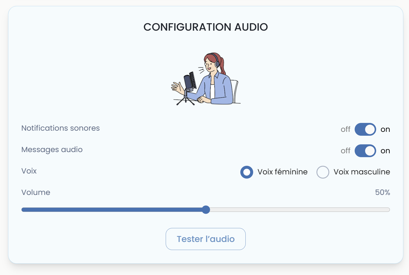 | Messages audio lors des alertes | Activé / Désactivé |