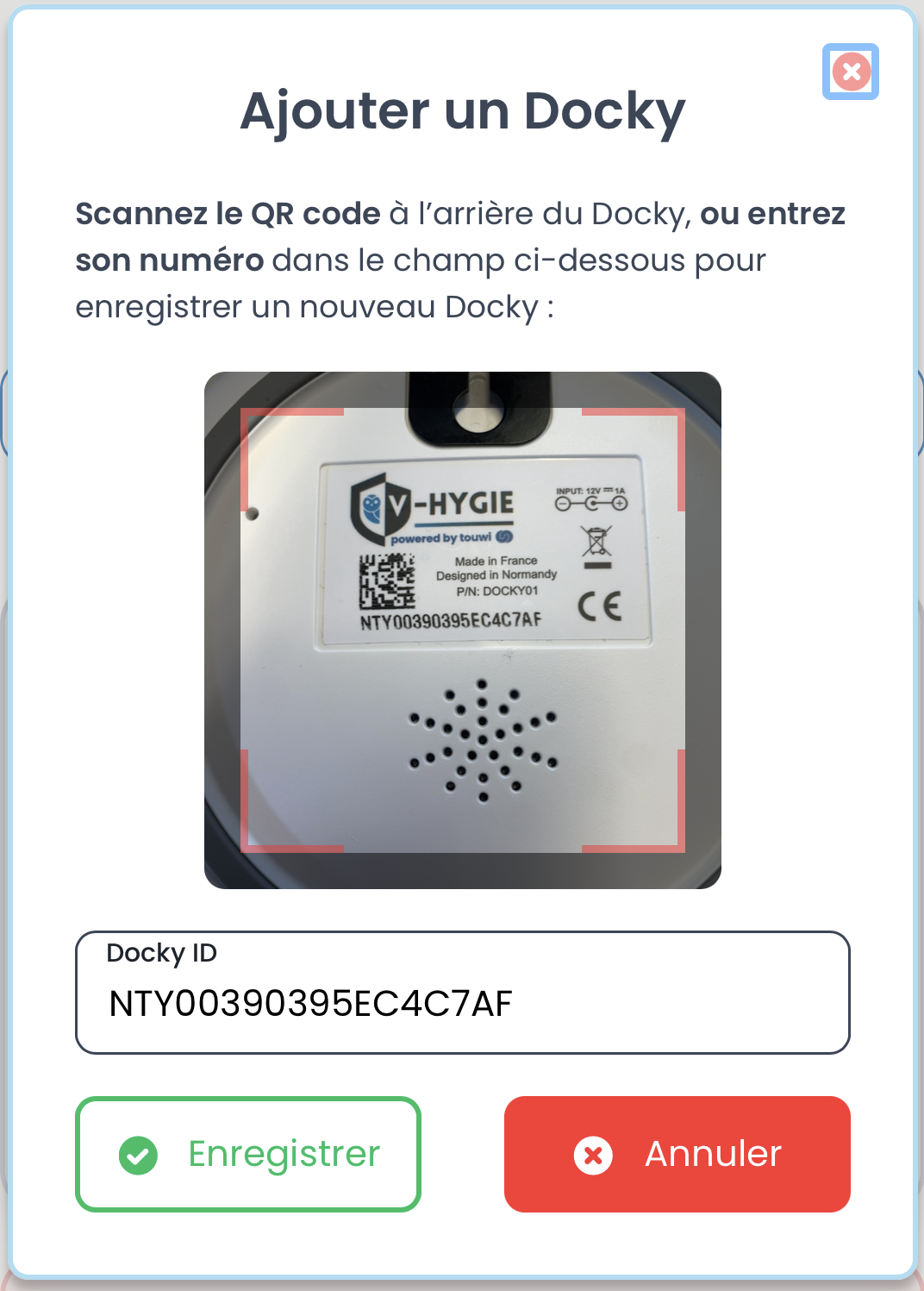 💡 Si le QR code ne peut pas être scanné, saisir manuellement le numéro inscrit sous le QR code au dos du Docky.