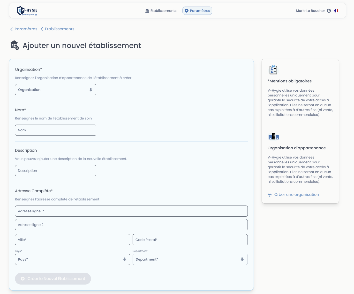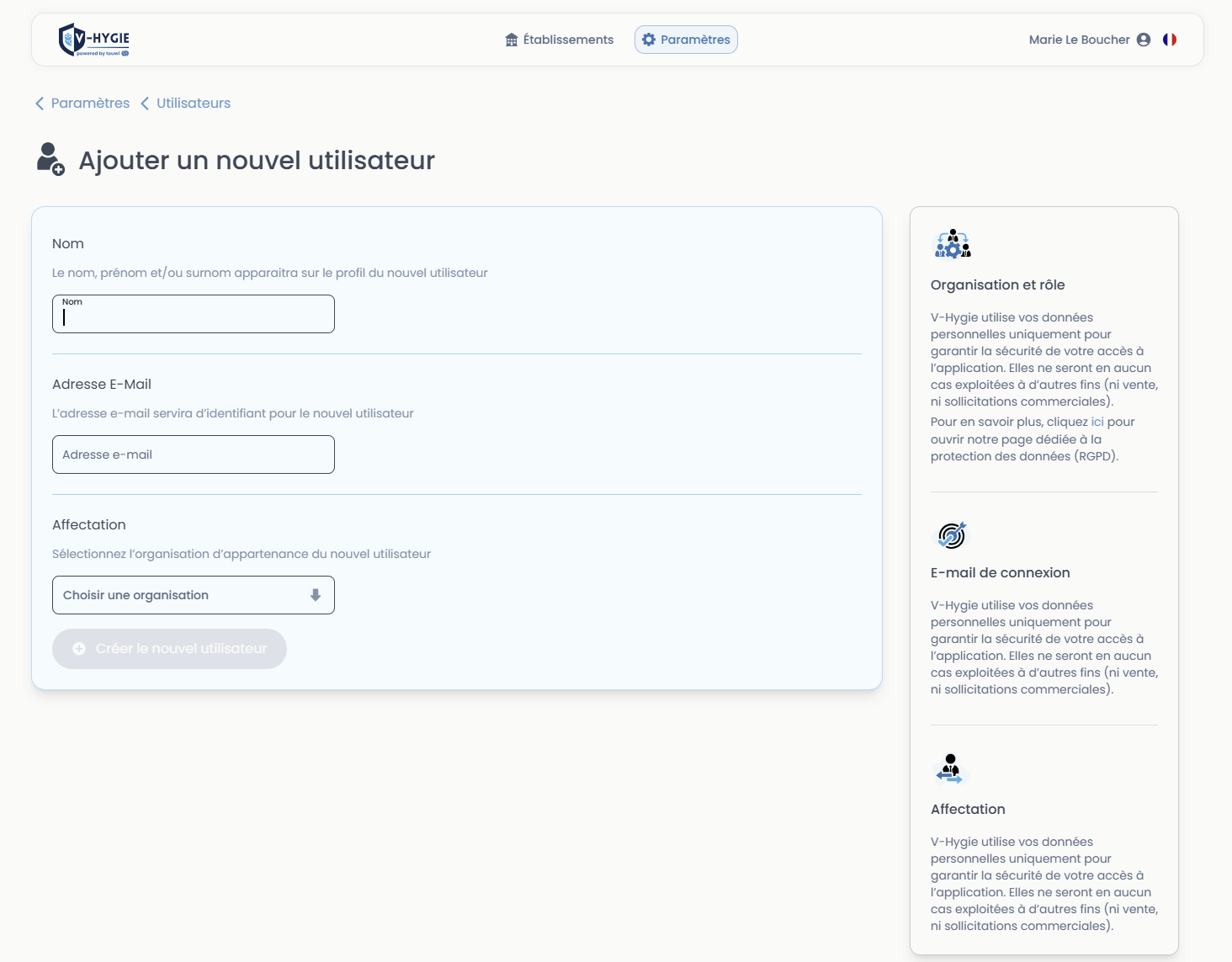 Cette page couvre l'ensemble des réglages disponibles dans l'application V-Hygie, accessibles depuis la WebApp.