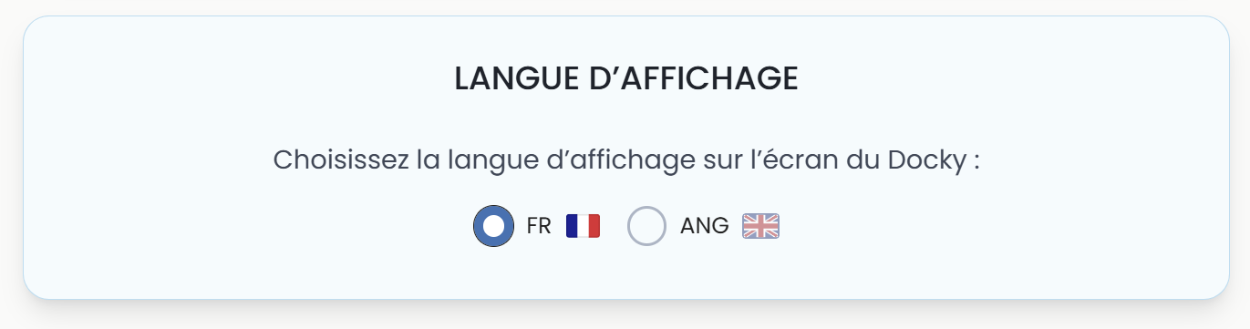 | Langue d'affichage | Langue des images affichées sur l'écran du Docky |