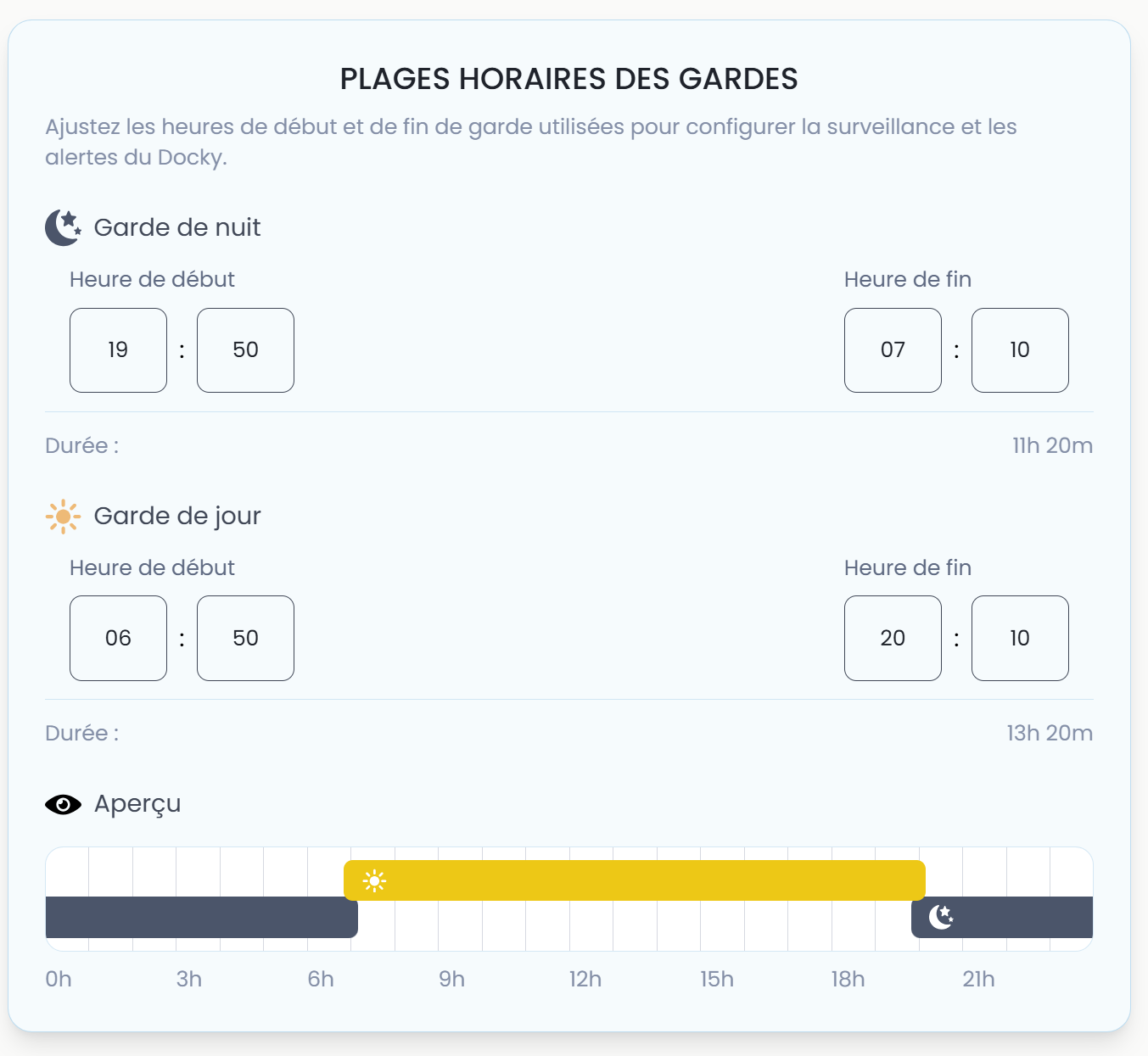 Le système distingue deux plages : jour et nuit. Par défaut : nuit de 20h00 à 8h00, jour de 8h00 à 20h00.
