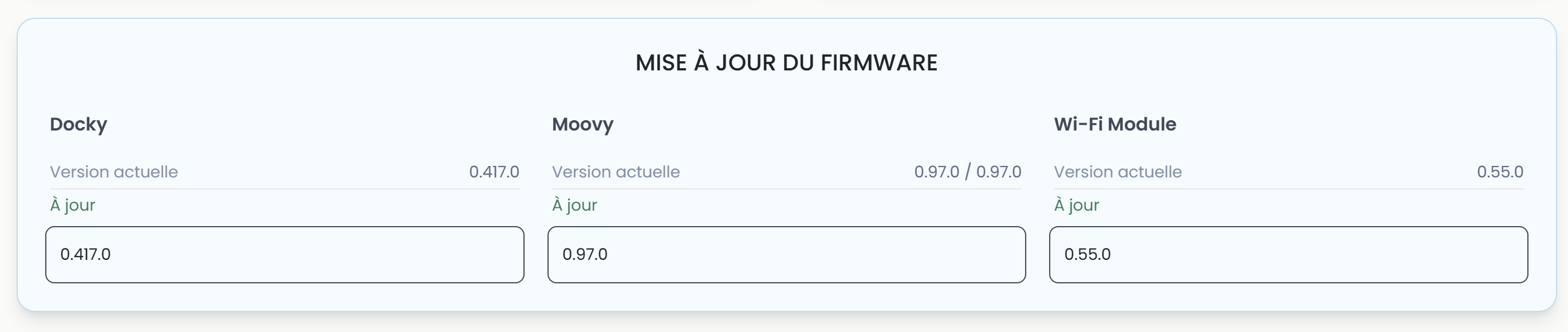 Les mises à jour du firmware du Docky et du Moovy sont manuelles et s'effectuent over-the-air (Wi-Fi ou 4G) depuis la WebApp. La version apparaît en vert lorsque la dernière mise à jour est installée.