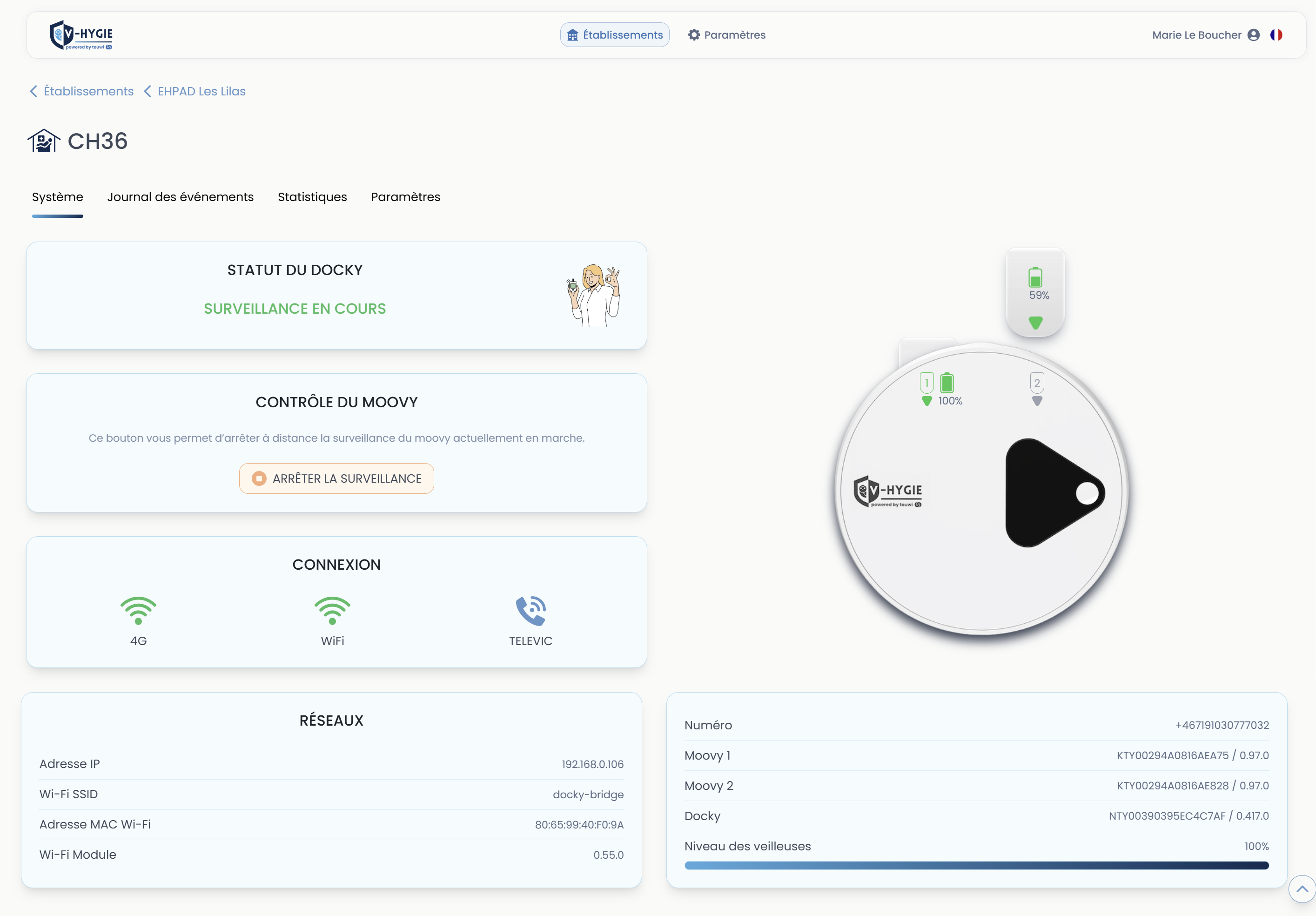 | Surveillance en cours | Vert | Docky en ligne, Moovy actif et surveillance démarrée |