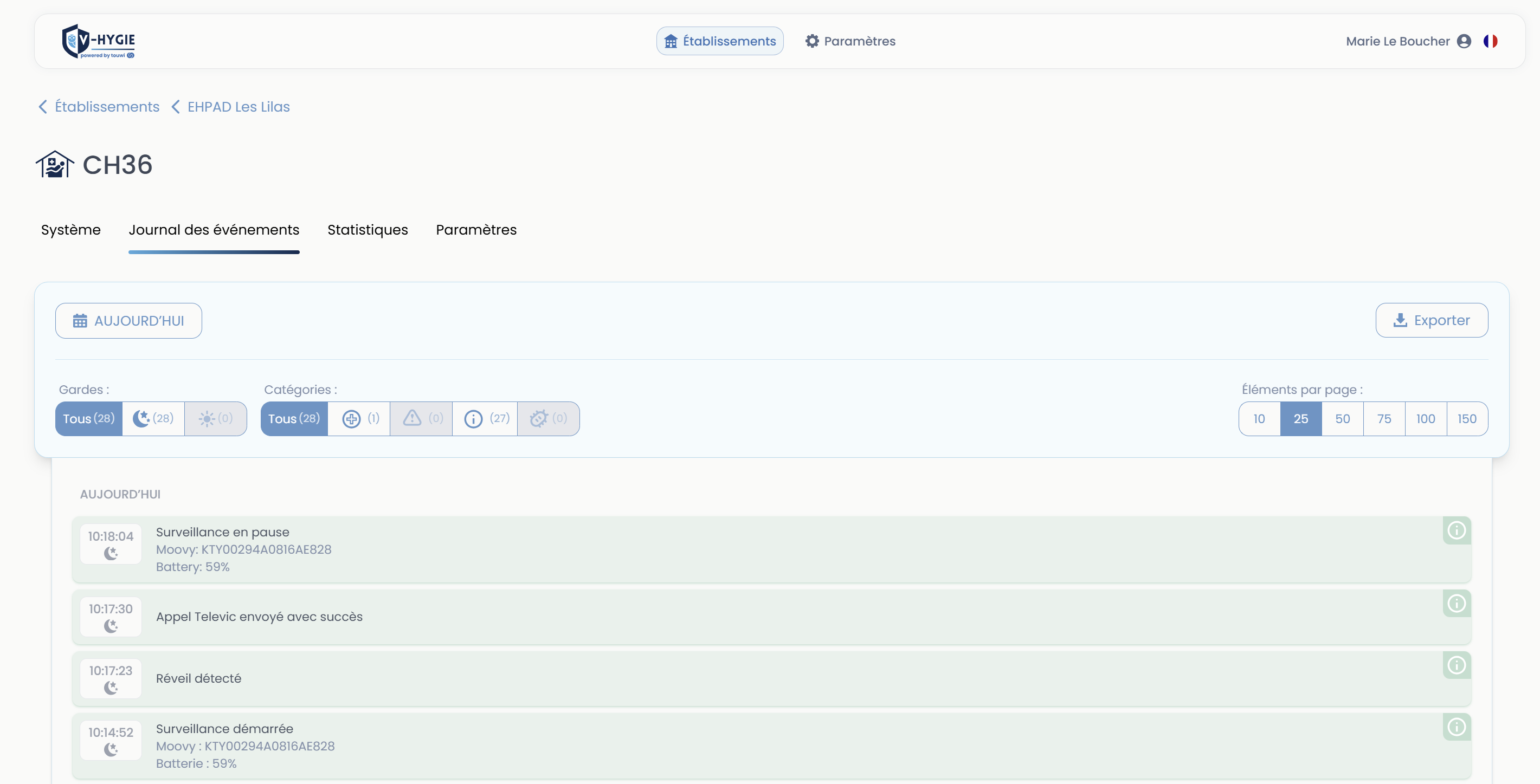 Le journal trace en temps réel tout ce qui se passe pour le résident. Il est accessible depuis l'onglet Journal des événements de la page chambre.