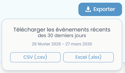 | Traçabilité complète | Journal des événements 30 jours, export CSV ou Excel |