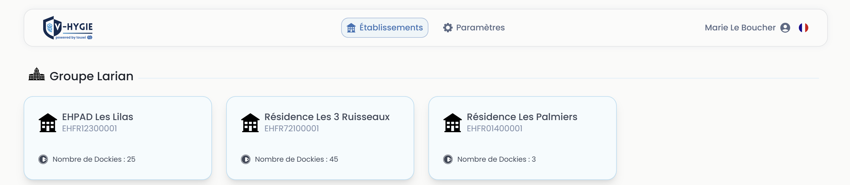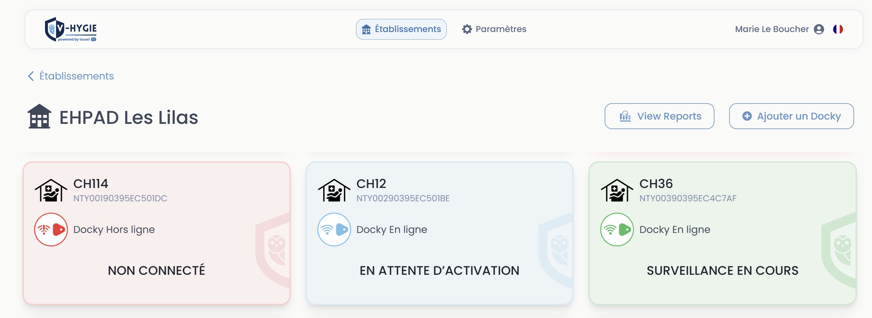 Depuis la vue établissement, chaque chambre affiche son Docky sous forme de carte colorée selon son statut :